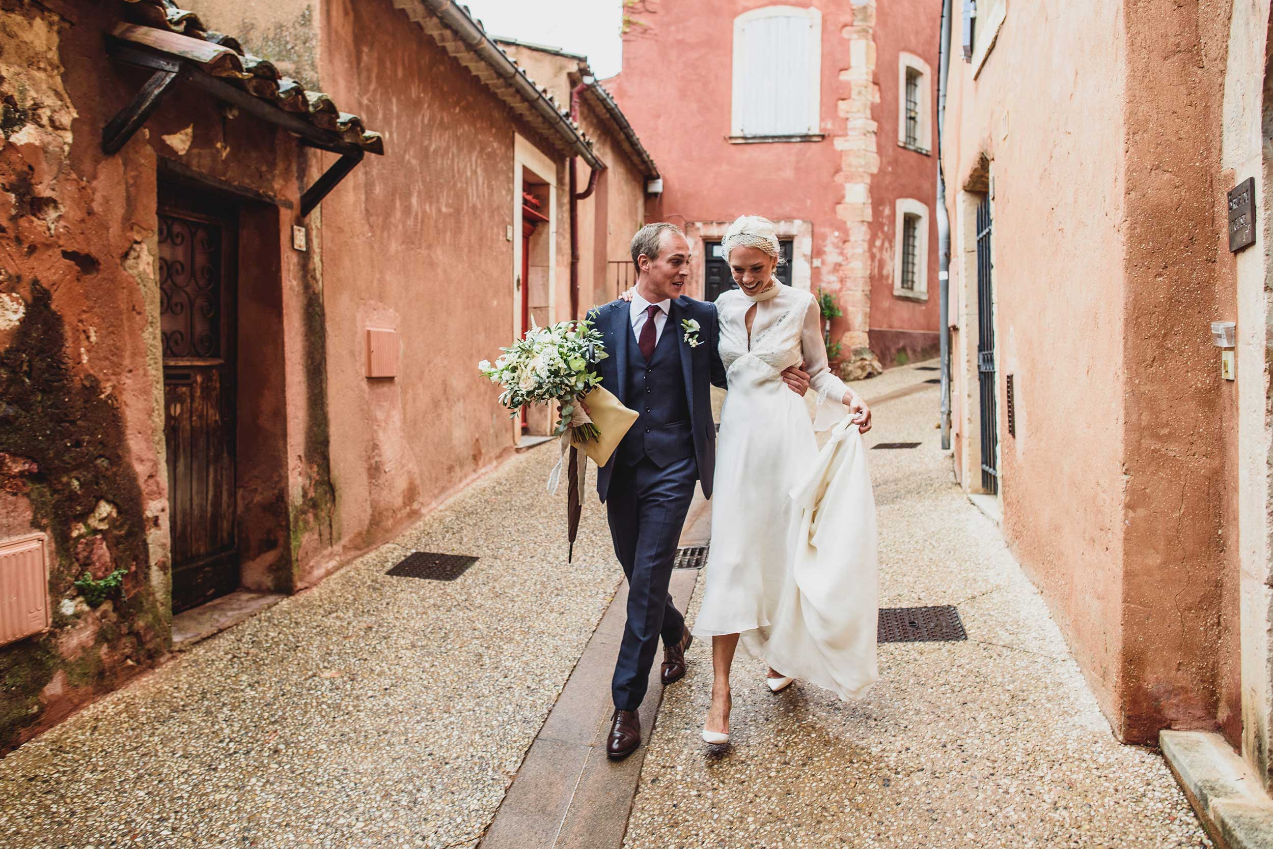 Meanwhile, the groom and the guests gathered down the road in the beautiful hilltop village of Roussillon. Although Rosie’s mother is a vicar, they had chosen a local vicar to conduct the ceremony at Saint Michel Church. The church came with its own permanent residents in the form of a swallow’s nest on the ceiling. They added some unexpected noise, and more than a little jeopardy for the guests as they dodged falling gifts! The rain became less torrential as Rosie arrived at church. In fact it had almost stopped completely by the time the couple left under a shower of lavender.