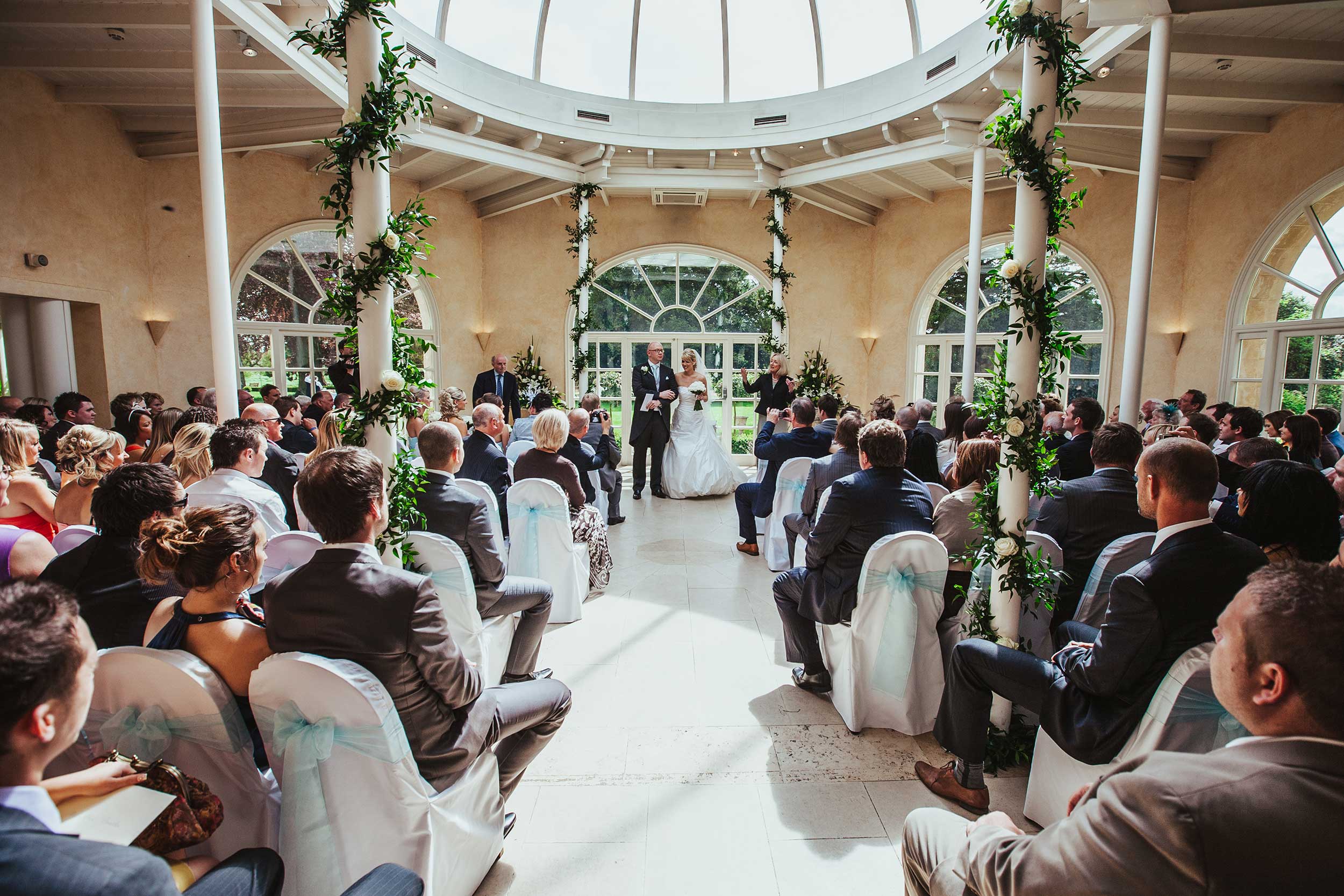 The ceremony took place in the Orangery with a performance by a gospel choir, and some tears from the groom. Guests and choir headed out into the gardens for the drinks reception. Meanwhile, the bride and groom had a few quiet moments over by the giant chess board. Then there was a quick receiving line as everyone headed into the Grand Hall for the wedding breakfast. There was a singer crooning Sinatra faves and that prompted most of the guests to get up and dance!